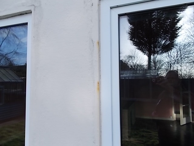 Corroding Steel in Burton on trent and Swadlincote. Rust discovered by our Chartered Surveyors on a Burton on trent and Swadlincote Homebuyers Survey and Report. The rust is caused by corrosion of the steel beads used to give the external render a straight edge. The rust may eventually force the render off. Unfortunately the only way to remedy the problem is to remove the angle bead and insert another which is not expensive. However most would than want to repaint the unsightly patch repair of the render and it then becomes necessary to paint the whole elevation for a satisfactory finish.